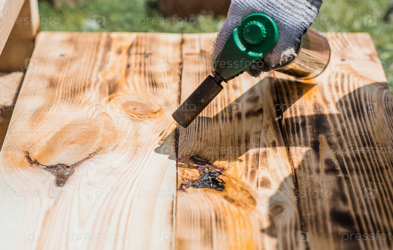 Процесс сжигания деревянных досок с помощью горелки.Текстура древесины обрабатывалась огнем из горелки.Закрыть
