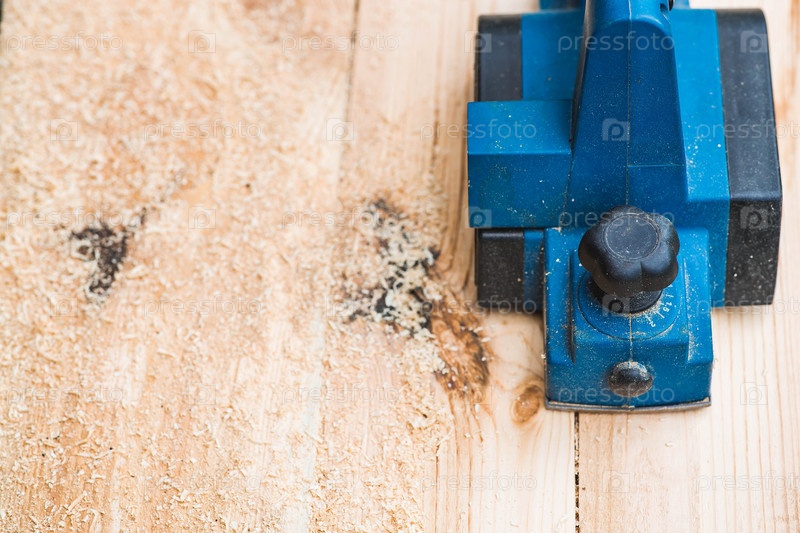 Ручной электрический планер в руках ремесленника. Человек планирует доски с помощью электроинструмента. Производство деревянных изделий. Строительство, обработка древесины