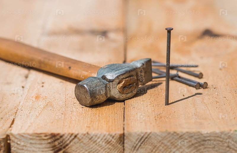 Закройте молот и гвозди на деревянных досках.Ручные инструменты, старые строительные орудия