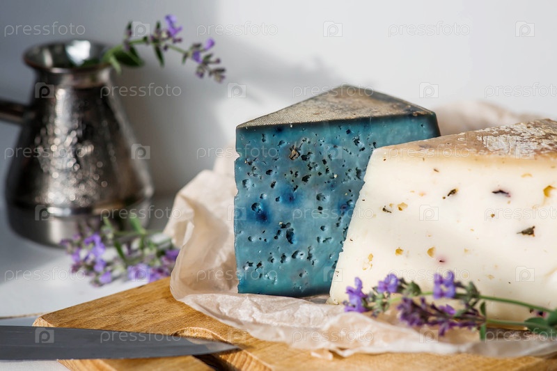 Кусок голубого, свежего, созревшего натурального фермерского сыра с лавандой на деревянной доске.Необычный вкус и качество сельскохозяйственной продукции