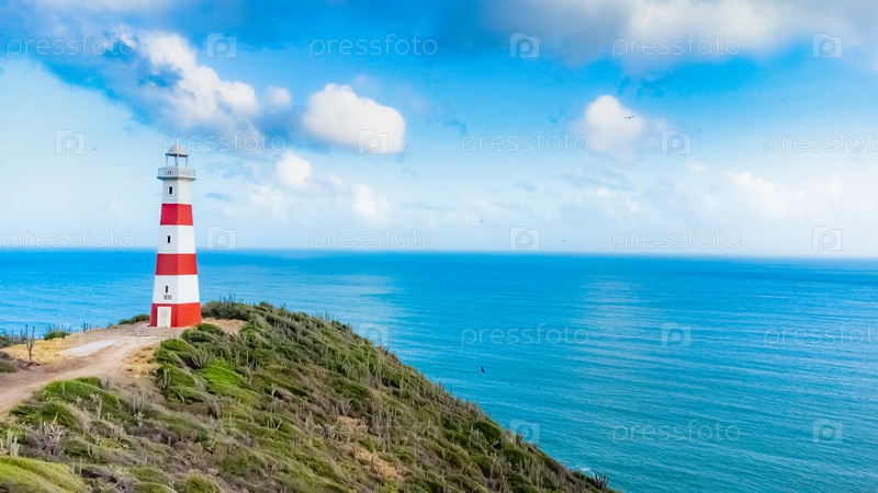 Красно-белый маяк у океана в солнечный день