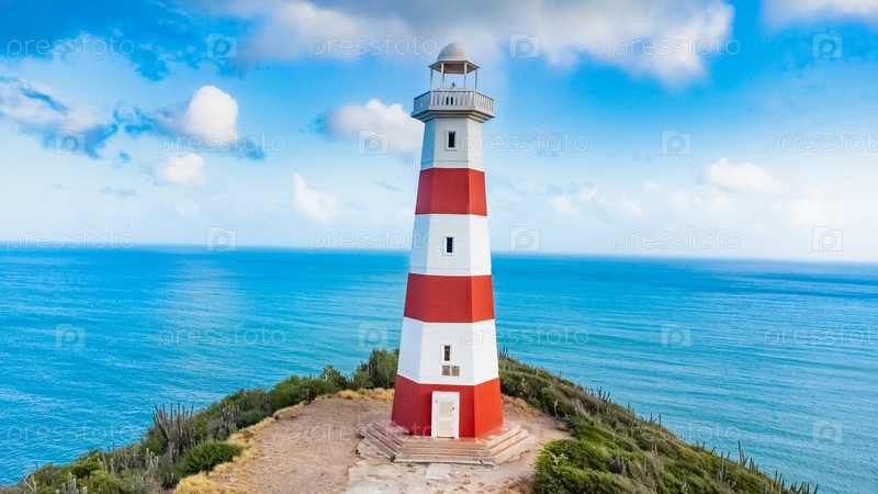 Красно-белый маяк у океана в солнечный день