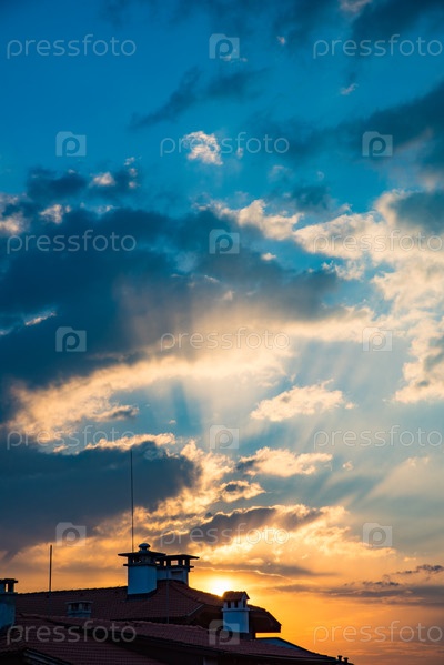 Прекрасный закат над крышами с проникающим солнечным светом