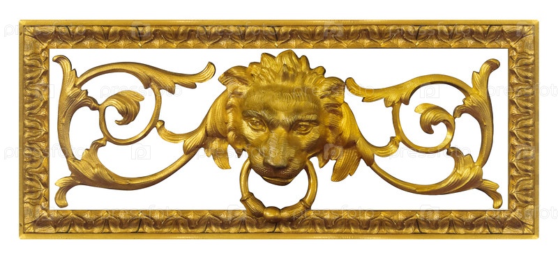 Декоративный элемент в виде головы золотого льва выделяется на белом фоне