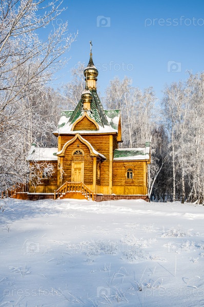 Деревянная часовня в зимней Сибири