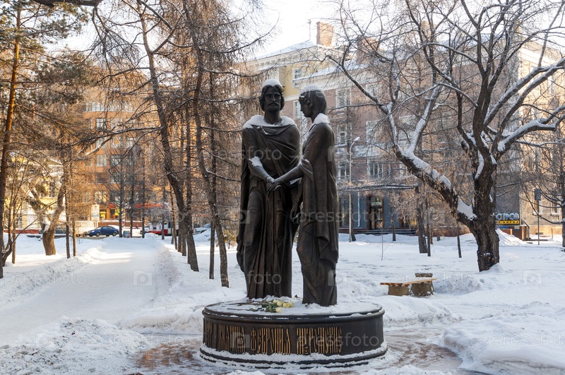 Скульптура Петра и Февронии в Омсе.Зимний день