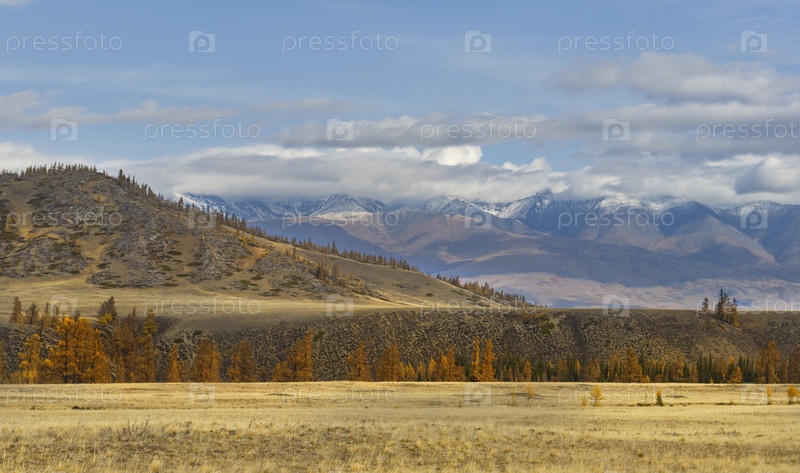 Юг Западной Сибири, горы Алтай. пустынные осенние степи вдоль северного хребта Чуй с одинокими деревьями возле села Курай на Чүйском участке