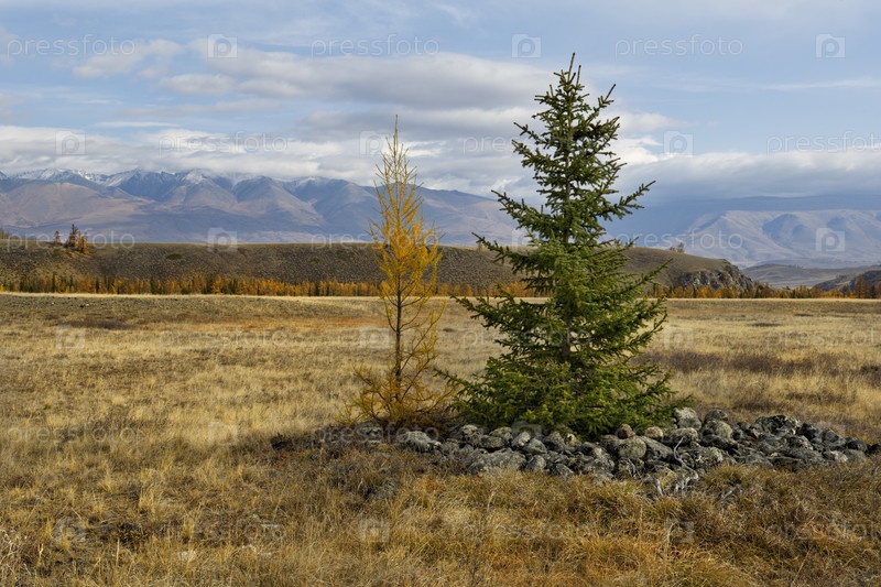 Юг Западной Сибири, горы Алтай. пустынные осенние степи вдоль северного хребта Чуй с одинокими деревьями возле села Курай на Чүйском участке