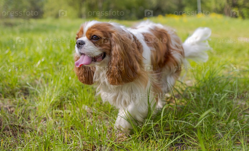 Кавалерийский король Чарльз-спаниель на прогулке по летнему парку