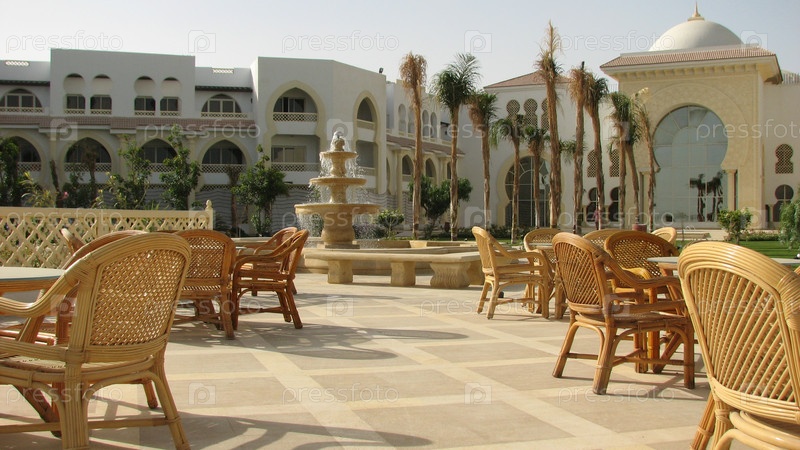 Летняя терраса с виковой мебелью и фонтаном возле здания восточного стиля, Египет, Отель 'Старый дворец', Саль Хашиш