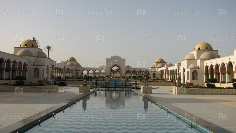 Здание восточного стиля, Египет, Сахль Хашиш, арки и купола, бассейн с отключенным фонтаном и архитектурные сооружения с видом на пальмы