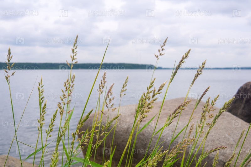 Трава на скалистом берегу озера с облачным небом