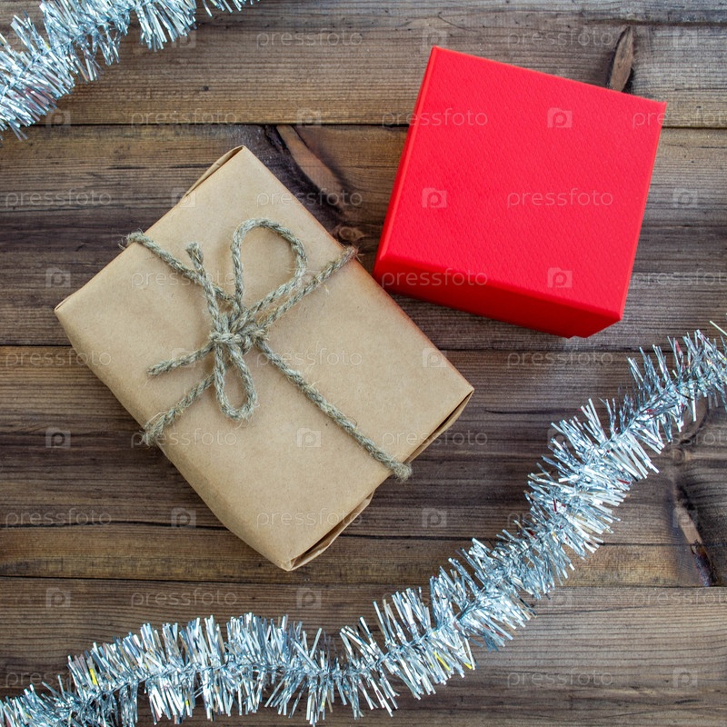 Рождественские подарки и чаша на деревянном фоне