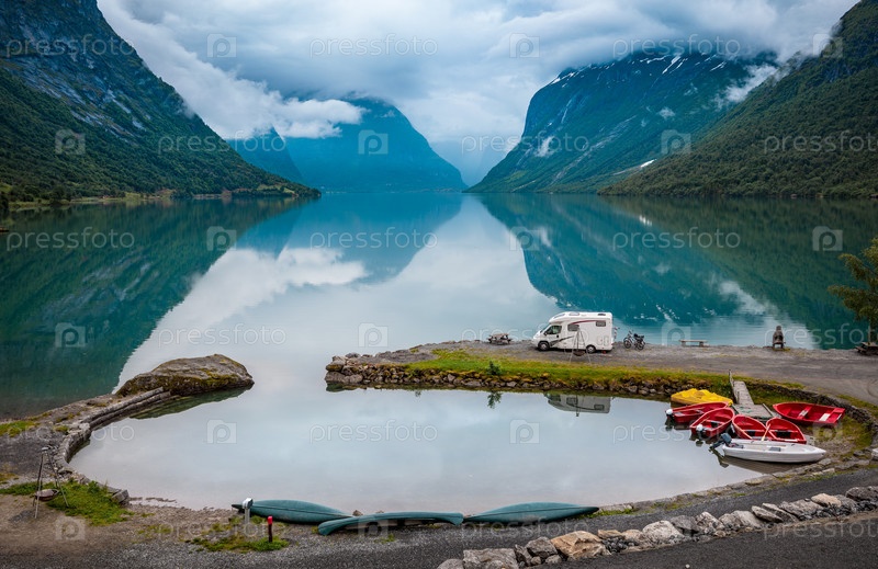 Семейные каникулы путешествия RV, отдых в трейлере, Караванный автомобиль Vacation.Norwegian fjord