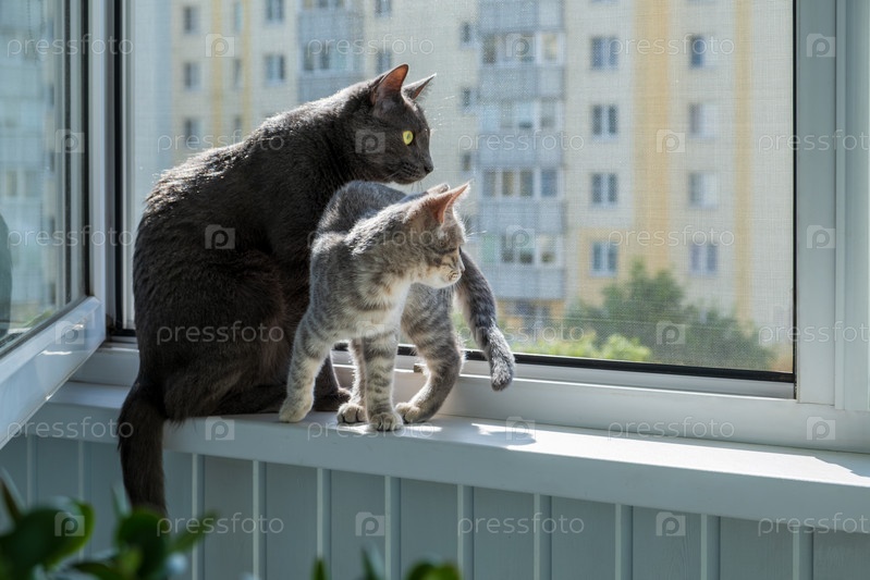 Кошки смотрят сценарий из окна через москитную сетку