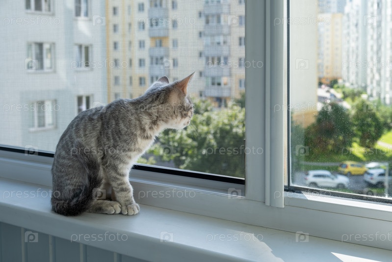 Любопытный котенок сидит у окна и смотрит сквозь комаристую сетку
