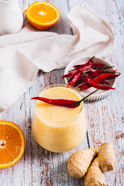 Оранжевый имбирный коктейль с перцем для похудения в стакане на столе вертикальный вид