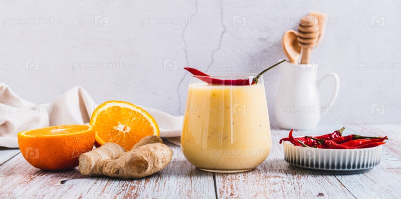 Смузи с апельсином, имбирем и кайенским перцем в стакане на столе