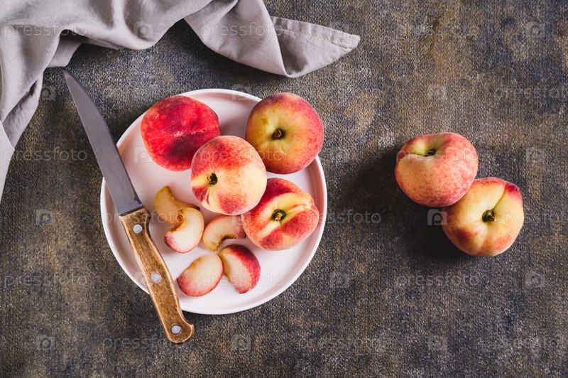 Целые и нарезанные плоские персики и нож на тарелке с видом на верхнюю часть стола