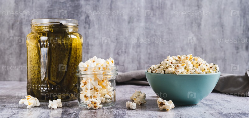 Огурцы уксус ароматный попкорн в миске на столе веб-баннер