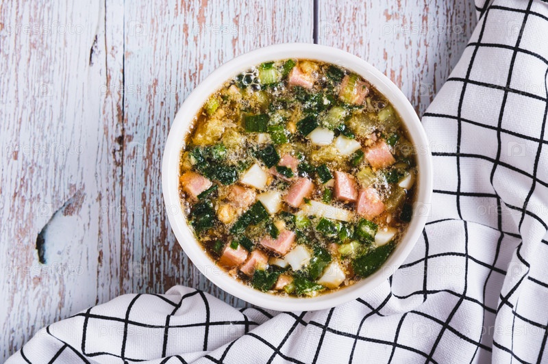 Закройте традиционный холодный овощный суп с квасом в миске на вершине стола