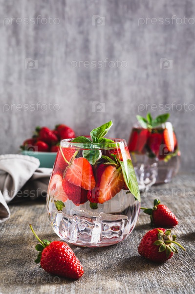 Летняя детоксикация с клубникой и базиликом в бокалах на столе