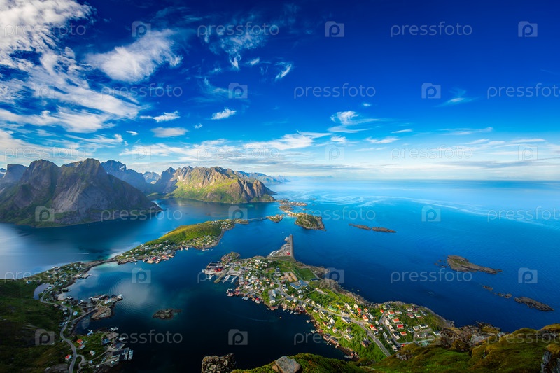 Удивительный пейзаж Лофотенских островов с вершины горы Рейнбренген с синим небом, округ Нордланд, Норвегия