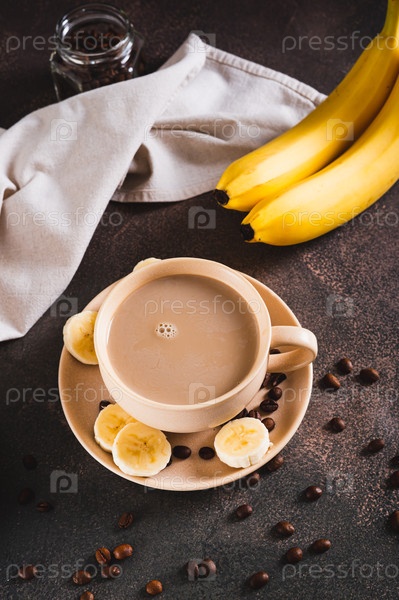 Смешанный мороженый банановый кофе в чашке на столе с вертикальным видом