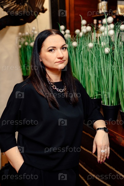 Уверенная деловая женщина в черном позирует во внутреннем интерьере ресторана с декоративными растениями