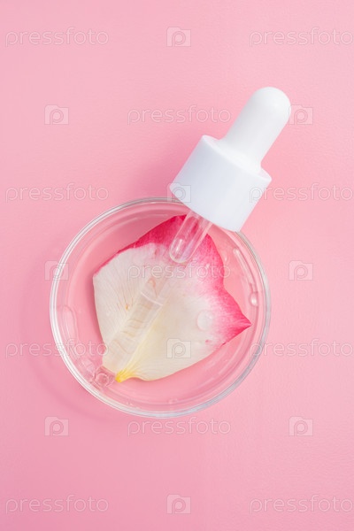 Косметический гель вокруг прозрачной капли сыворотки молока в чашке Петри на розовом фоне с лепестком роз. Концептуальные лабораторные испытания и исследования, производство и тестирование косметических средств