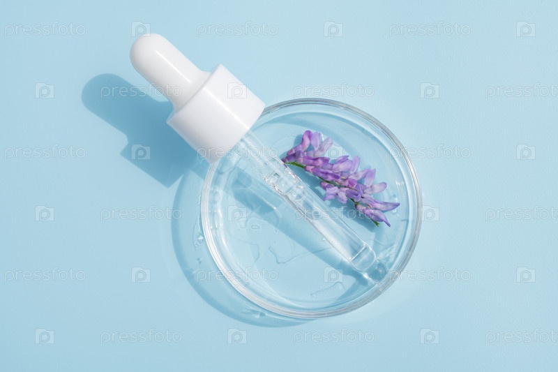 Сером косметической пипетки на чашечке Петри на синем фоне Концепция косметологии и фармацевтики Кислотная кожура, масло для лица, коллаген