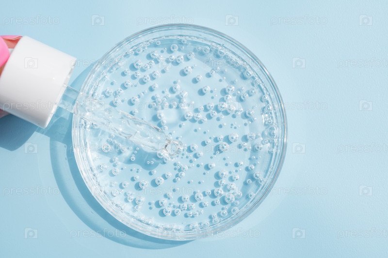 Косметическая пипетка с ромом на синем фоне вблизи. Стильная концепция органических эссенций, продуктов красоты и здоровья. Современный аптекарь. Близко