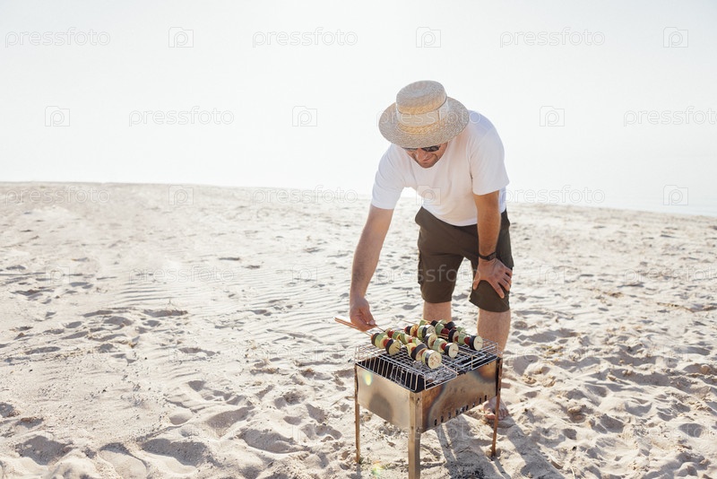 Молодой человек в летней повседневной одежде устраивает барбекю на пляже