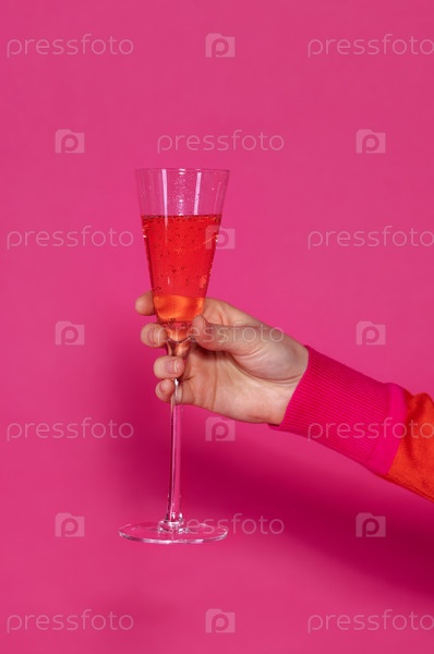Женская рука с элегантным бокалом шампанского на ярком фоне