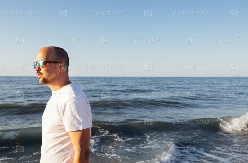 Молодой человек в белой футболке на фоне моря с волнами. мужчина средних лет в солнцезащитных очках смотрит на океан