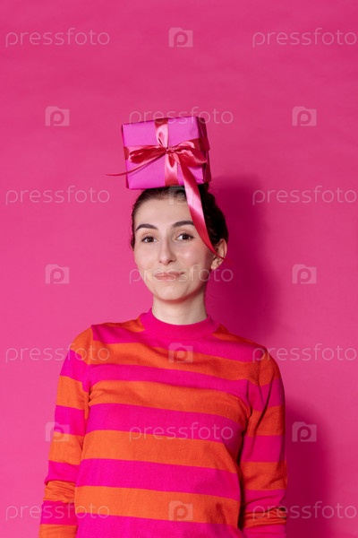 Молодая девушка в полосатом свитере держит на голове подарок с луком на розовом фоне