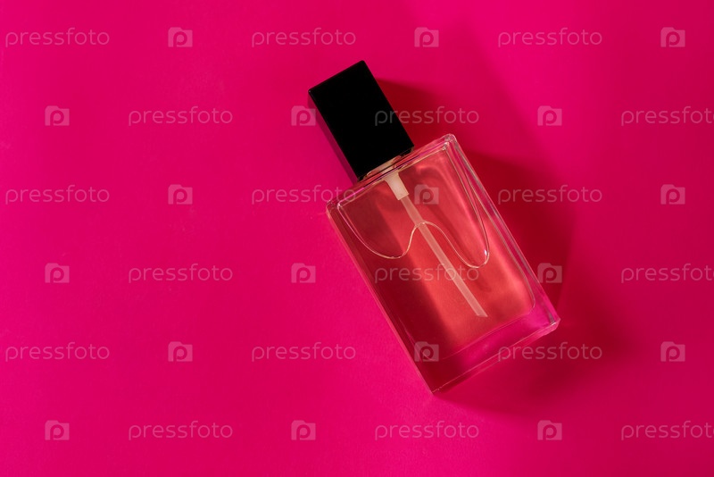 Закрытие прозрачной стеклянной бутылки с парфюмом. Бутылка ароматной воды на розовом фоне. Косметические изделия. Минимализм