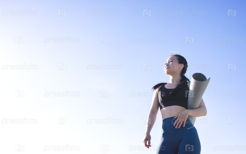 Азиатская женщина в активной одежде, держащая коврик для йоги, стоявшая на улице под чистым голубым небом, олицетворяющая фитнес и оздоровительный образ жизни с чувством расширения возможностей и спокойствия