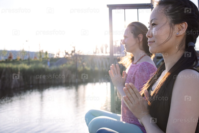 Две женщины практикуют медитацию осознанности с спокойным водным телом, окруженным пышной зеленью и мягким солнечным светом, воплощая мир и внутренний покой в естественной обстановке