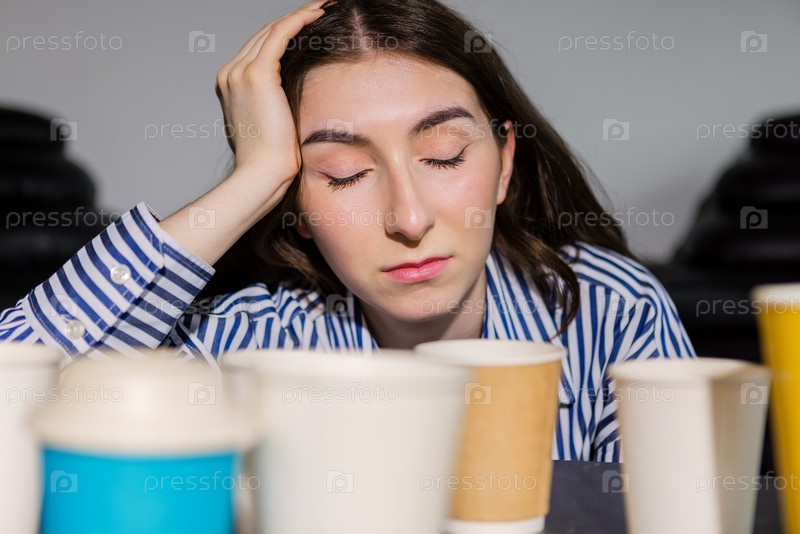 Молодая женщина в полосатой рубашке наклоняет руку над головой и выглядит усталой.Девушка закрывает глаза и садится за стол с несколькими одноразовыми чашами