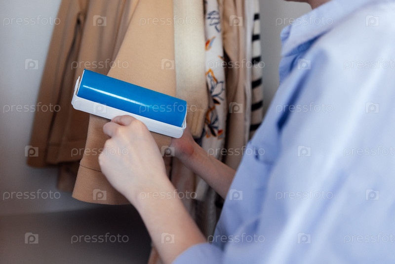 Молодая женщина в синей рубашке использует клейкий ролик, чтобы стирать свою одежду.Девушка стоит рядом с шкафом, содержащим различные пальто и куртки