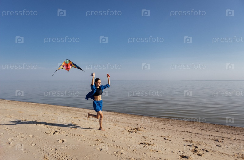 Подросток в повседневной одежде летает на воздушном змее на пляже.Девушка смеется и бежит по песчаному пляжу
