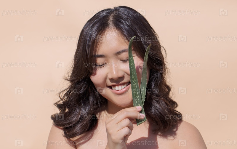 Молодая женщина с темными волосами счастливо держит свежий лист алоэ вера, демонстрируя естественную красоту и преимущества ухода за кожей, на мягком нейтральном фоне подчеркивая ее сияющую улыбку и здоровую кожу