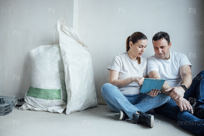 Молодой человек и молодая женщина сидят на полу пустой комнаты с ремонтным материалом. Пара смотрит на табличку и обсуждает будущий интерьер. Муж и жена планируют место в доме