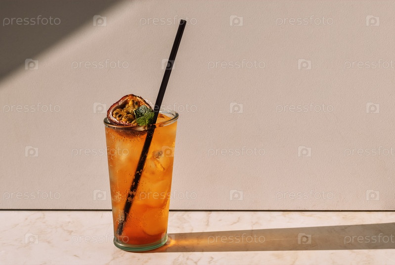 Паровое стекло с вкусным газированным напитком и страстными фруктами. прохладная чашка фруктовой соды с кубиками льда на мраморном столе. восхитительный охлажденный коктейль, украшенный свежей мятой. минимализм. солнечный свет