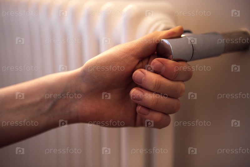 Человеческая рука и металлическая ручка отопительного устройства.Женщина регулирует температуру на обогревном радиаторе.Рука опирается на белый радиатор