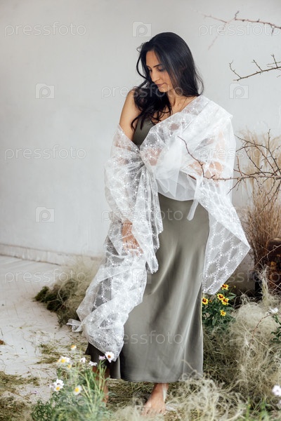 Молодая беременная женщина, завернутая в светло-белый шаль и стоящая на траве. спокойная будущая мама в зеленом атласном платье позирует среди сушеных цветов