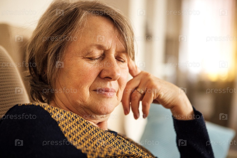 Закрытие пожилой женщины, страдающей от головной боли.Зрелая женщина закрыла глаза