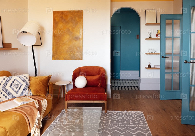Стильный современный интерьер гостиной. арочный проход в коридор и ярко-синие двери. элегантная напольная лампа, диван и стул. стеклянный кофейный стол