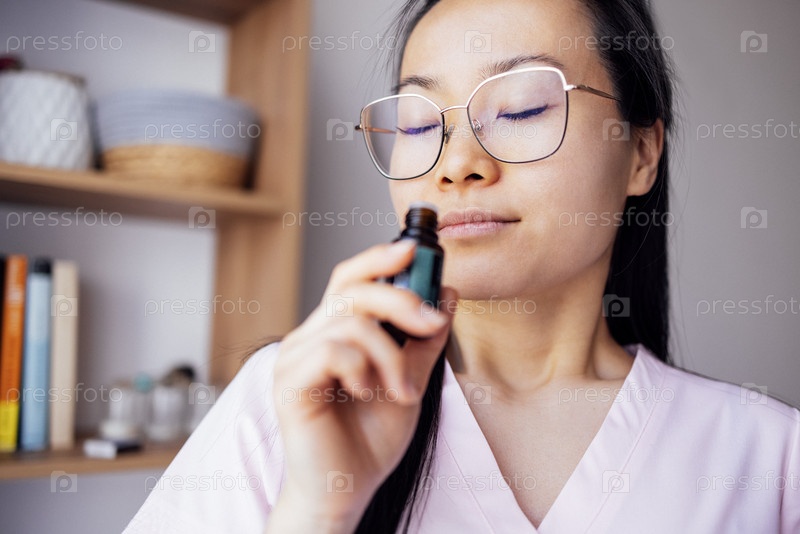 Молодая азиатка в повседневной одежде пахнет эфирным маслом, привлекательная корейская женщина с очками закрывает глаза и чувствует запах масла из темной бутылки